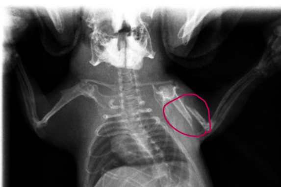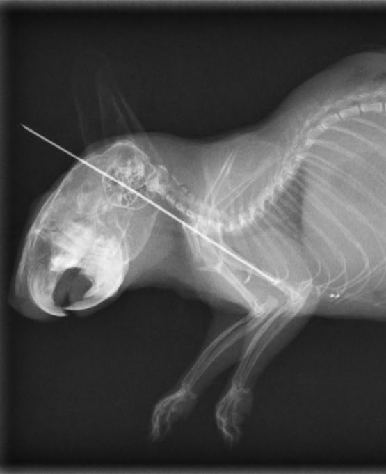 デグーは非常に活発な性質を持ち、転落や挟まり、飼い主との接触事故、他個体との争いなどにより骨折を起こすことがあります。特に橈骨や脛骨などの四肢の長骨、あるいは尾の骨に骨折が多く見られます。骨が細く、比較的わずかな衝撃でも骨折する可能性があるうえ、カルシウムやビタミンDの不足、慢性疾患によって骨が脆くなっている場合にはさらに骨折しやすくなります。